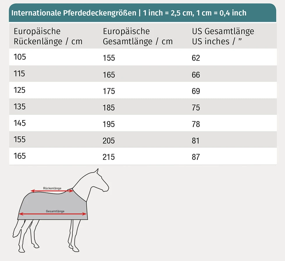 Zapewnij swojemu koniowi optymalny komfort na świeżym powietrzu w chłodne dni dzięki derce padokowej Waldhausen Nordic. Podwójne zapięcia w kształcie litery T z przodu zapewniają idealne dopasowanie. Lamówka z odblaskowymi detalami zwiększa widoczność w warunkach słabego oświetlenia. Zakładka zapewnia dużą swobodę ruchów. Materiał wierzchni o grubości 600 denierów jest wytrzymały i zapewni Twojemu koniowi ciepło i suchość. Wkładka Stay Clean: Koniec z końskim włosiem na derkach, które zostały tylko raz przymierzone. Wkładka Stay Clean firmy Waldhausen to praktyczne, innowacyjne rozwiązanie, które pozwala na higieniczne i łatwe przymierzanie derek dla koni, bez ich brudzenia i pokrywania sierścią. Wkładka jest bezpośrednio zintegrowana z nowymi derkami zewnętrznymi Waldhausen i przymocowana od wewnątrz, co zapobiega bezpośredniemu kontaktowi grzbietu konia z derka. Rezultat: derka pozostaje czysta, nawet jeśli została użyta tylko raz do przymiarki. Należy pamiętać, że wkładka Stay Clean jest przeznaczona do krótkotrwałego stosowania podczas przymiarek, a nie do stałego użytkowania. Można ją łatwo usunąć, po prostu ją odklejając. - Tkanina ripstop 600 den - Oddychający - Wodoodporny (słup wody 3000 mm) - Podwójne zapięcie z przodu w kształcie litery T - Pętelki mocujące do przymocowania opaski na szyję (tylko od rozmiaru 115 cm) - Kompatybilny z systemem przypinania derki (oczka i kółka do przymocowania derki) - Zakładka na tył - Paski krzyżowe - Klapa tylna - Brzeg z odblaskowymi elementami dla dobrej widoczności - Praktyczny pokrowiec na derki Waldhausen - Z wkładką zapobiegającą zabrudzeniu Materiał zewnętrzny: 100% poliester Podszewka: 100% poliester Wypełnienie: 100% poliester