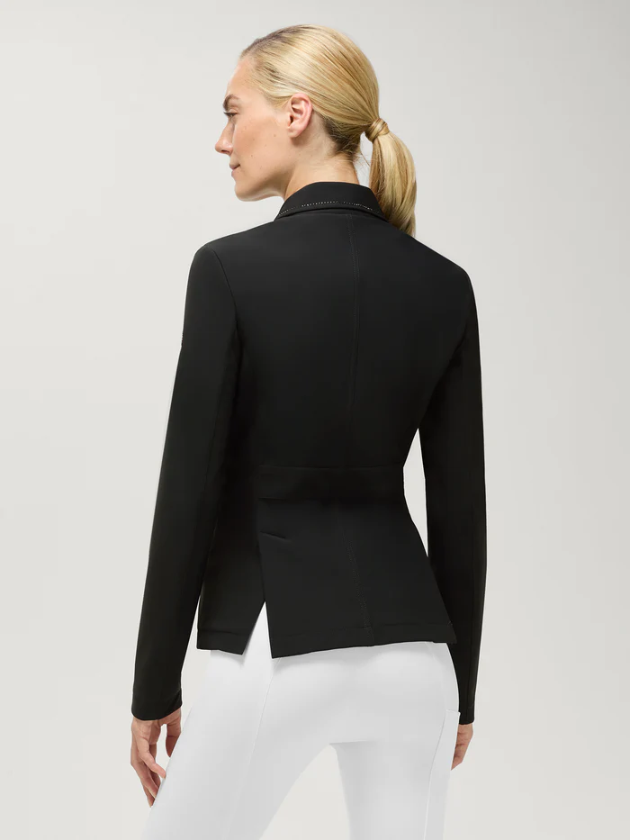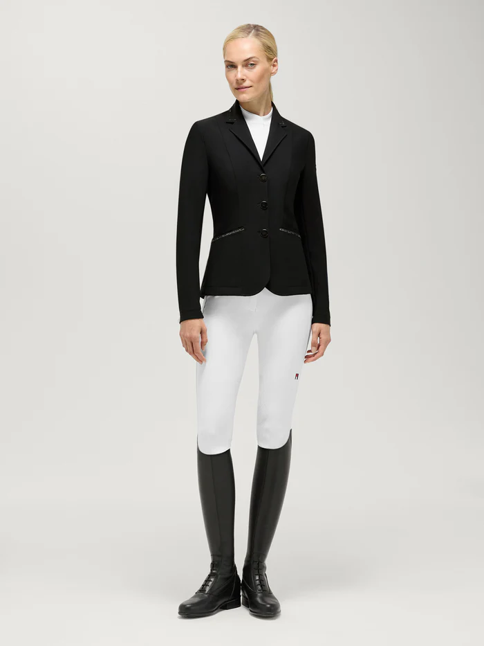Klasyczny frak konkursowy z elastycznego materiału, ozdobiony czarnymi kryształkami w zdłóż kieszonek.