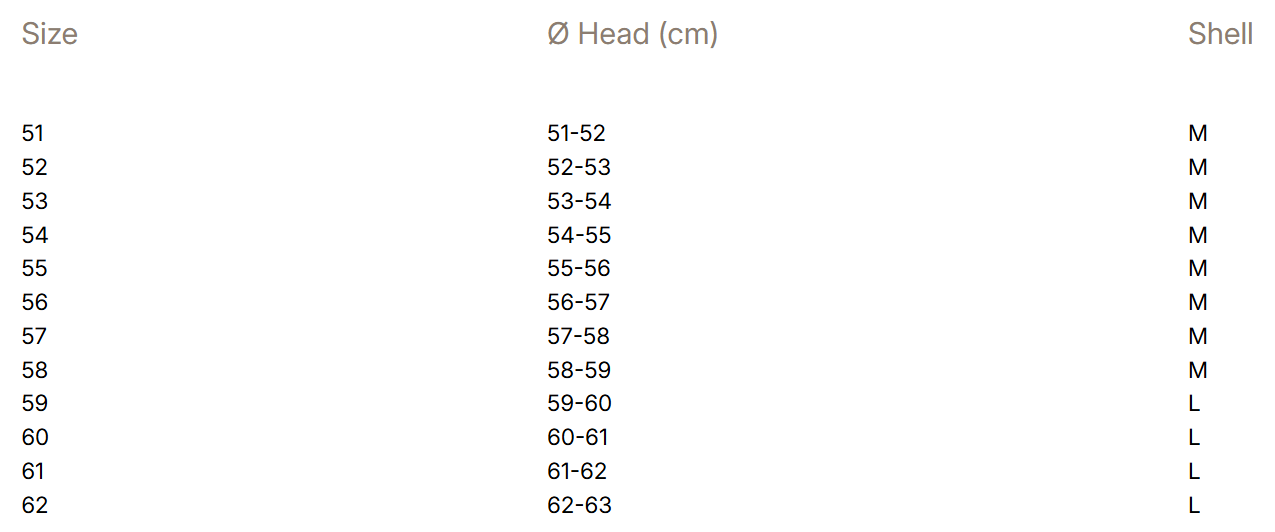 Do każdego z rozmiarów skorupy pasuje kilka wymiennych wkładek w rozmiarach obwodu głowy.