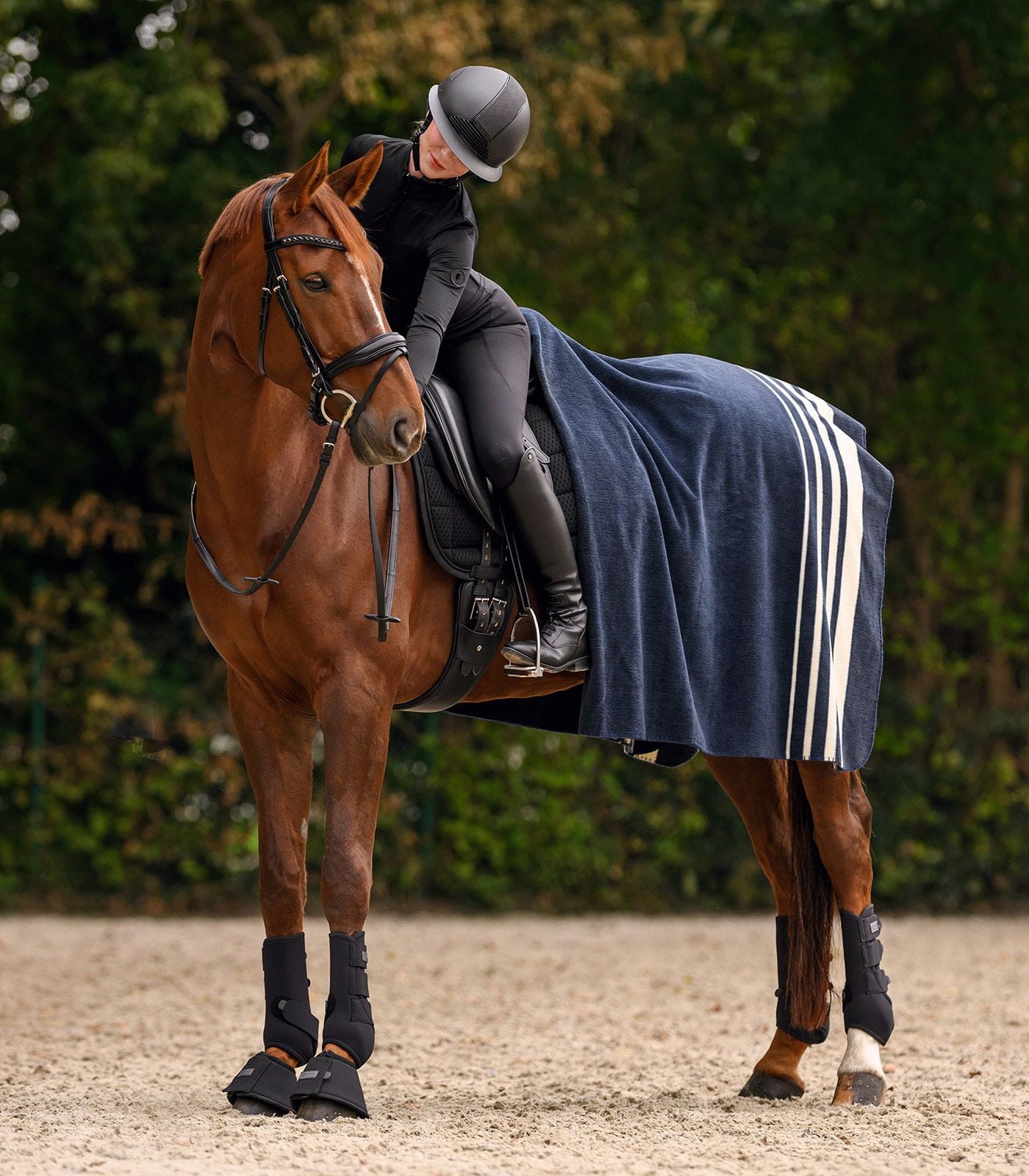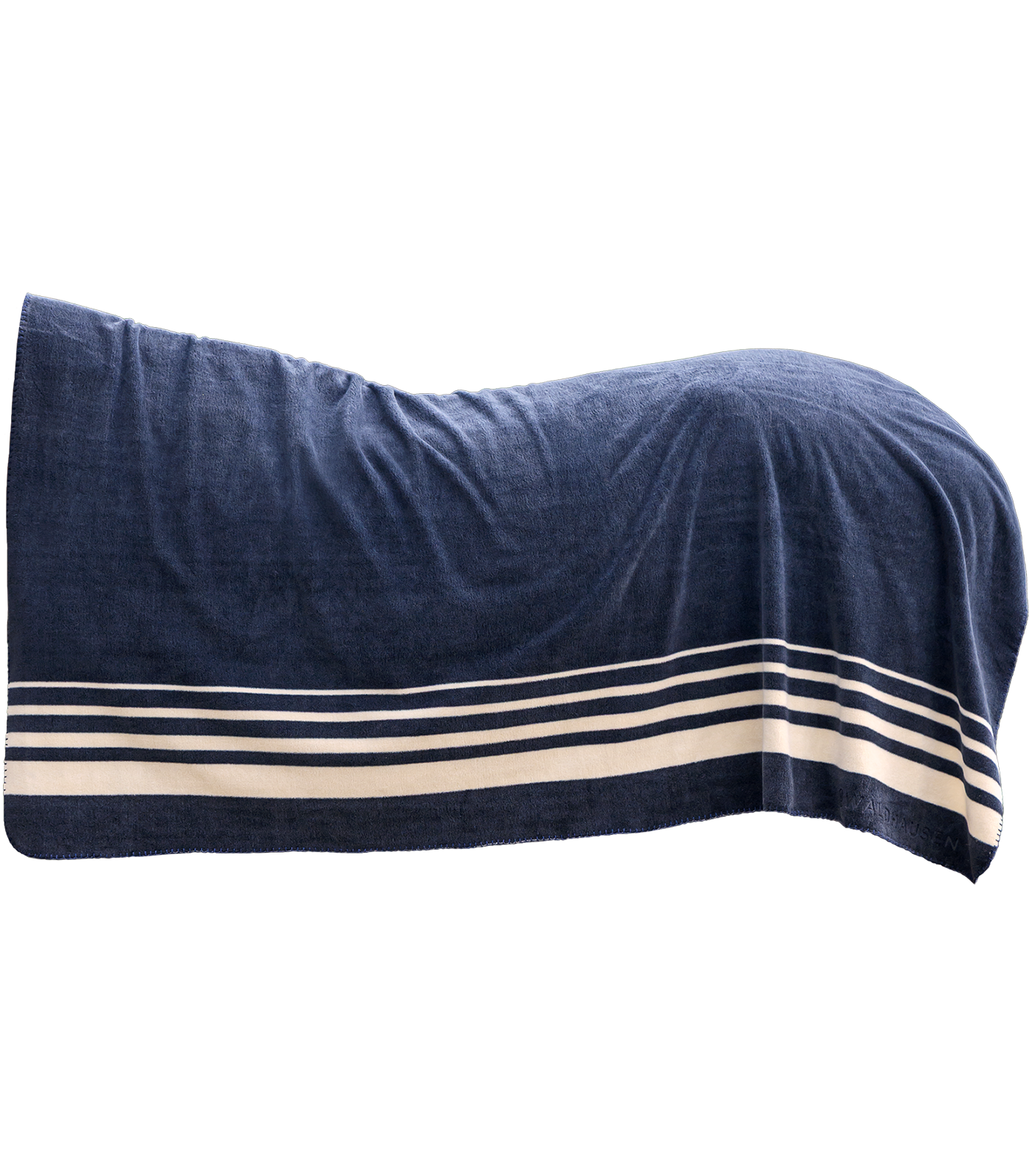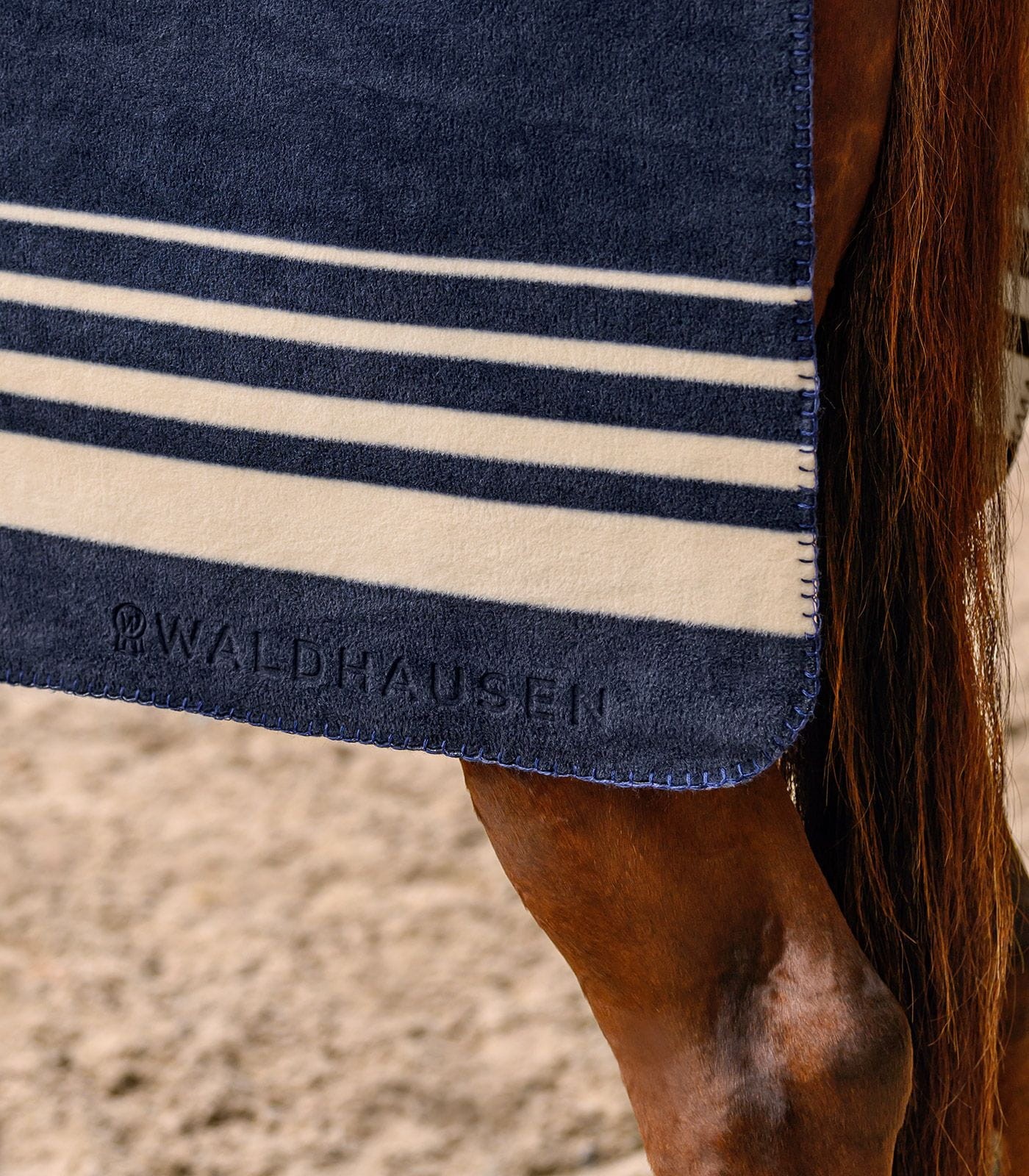 Stylowy koc polarowy Sölden w pięknym, ciemnym odcieniu granatu, ozdobiony beżowymi pasami. Gruby materiał (330 g/m²) zapewnia optymalne ciepło dla konia i jeźdźca w chłodne dni. Wymiary: 210 x 200 cm, materiał: 100% poliester