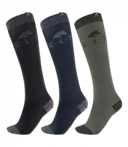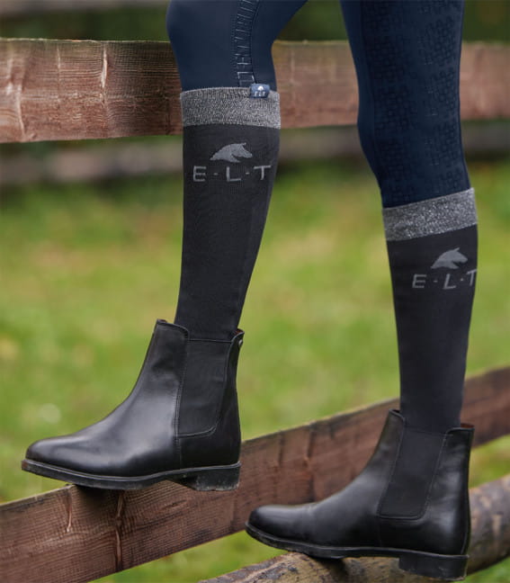 Podkolanówki bardzo dobrej jakości, ozdobione brokatowymi wykończeniami w kontrastowych odcieniach na pięcie, palcach oraz przy górnym ściągaczu. Dodatkowo motyw konia oraz logo z boku.